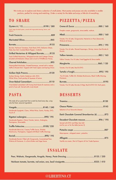 Welcome to the wild side of Italian dining, where handmade pasta and Neapolitan pizzas meet disco vibes and a sun-soaked terrace. Our menu changes with the seasons, much like your ex’s excuses. We’re all about the freshest local ingredients, which means our specials are as unpredictable (and irresistible) as a leopard in a disco—because life’s too short for bad carbs.